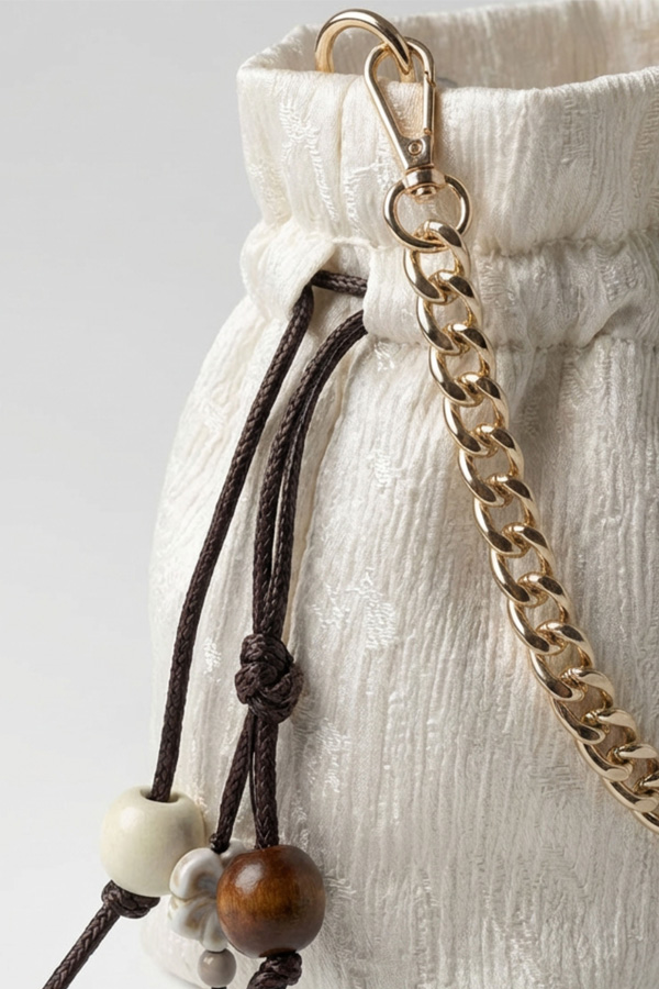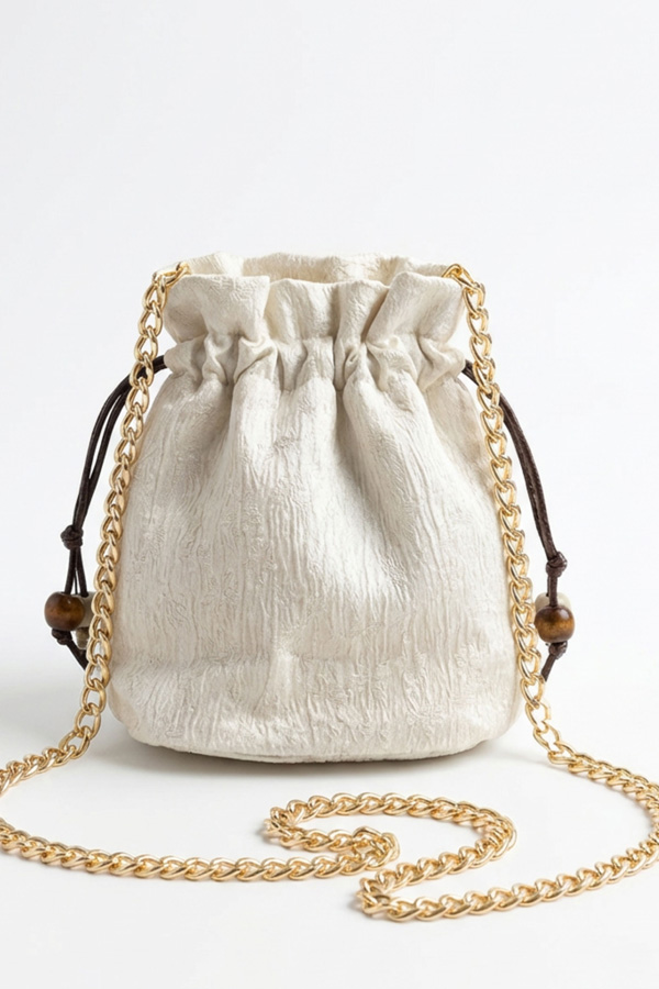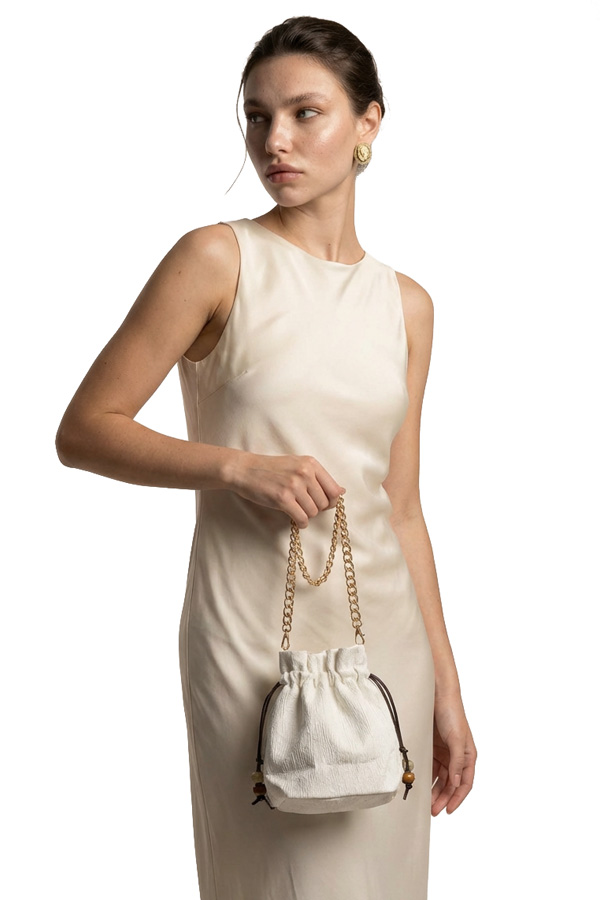 Diseñado con cadena dorada, cierre metálico y etiqueta interior VECIANA cosida a mano, pieza única atemporal para ocasiones especiales.